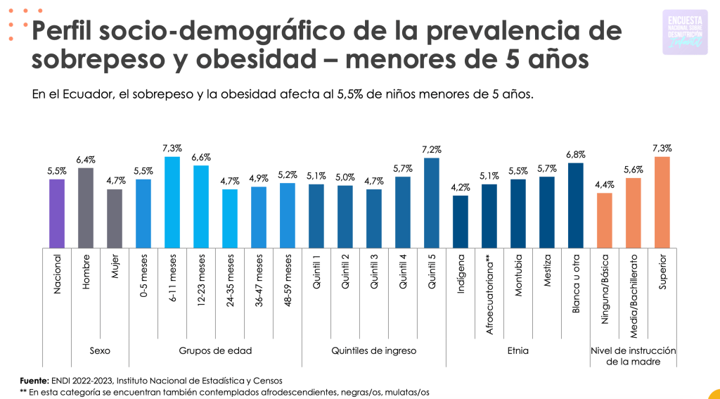 Para 2023, de acuerdo con la Encuesta Nacional de Desnutrición Infantil (ENDI) elaborada por el Instituto Nacional de Estadística y Censos (INEC) del Ecuador, la alimentación de cientos de niños en el país se basa en productos ultraprocesados y altos en azúcar. Esto ha provocado que el 5,5% de niños menores de cinco años sufra de sobrepeso u obesidad.